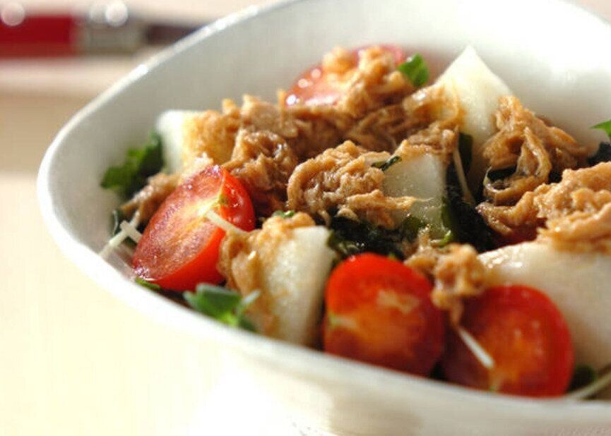 梨の甘みと、ワカメやトマトなどの食感を楽しめるサラダのレシピ。混ぜ合わせたツナの風味もおいしく、和風ドレッシングとの相性もばつぐんでさっぱりと食べられます。手軽につくれて、和食の副菜にぴったりですよ。