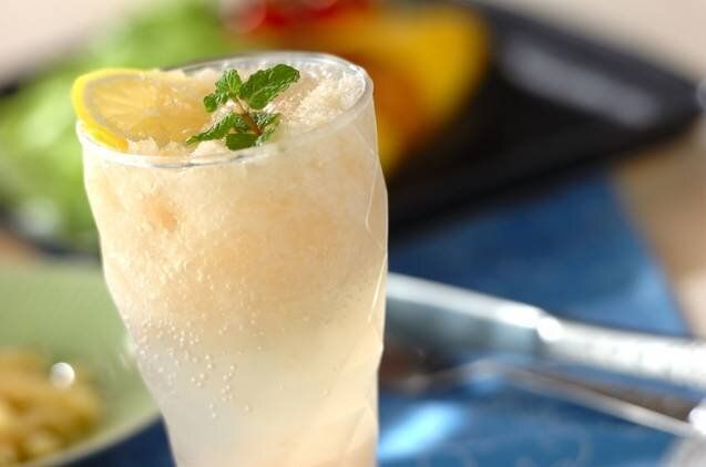 つくりたてのフレッシュさがたまらない、梨を入れたサイダーです。シャリシャリの梨と、シュワシュワのサイダーのバランスが絶妙な一品。ミントの葉を飾ると、見た目もおしゃれに仕上がります。