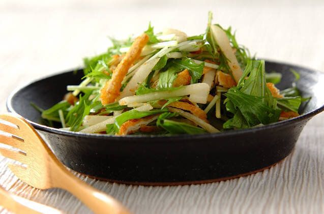 梨と水菜を組み合わせた、和風サラダのレシピ。みずみずしい梨と、歯応えのある水菜がよく合います。ドレッシングにはゆずこしょうを加えて、ピリッとした辛味と風味をプラス。