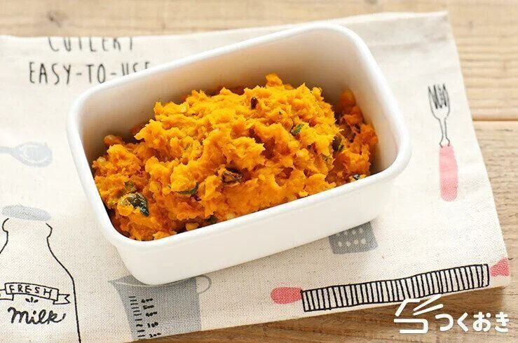 かぼちゃにレーズンとナッツを加えた、華やかな見た目のサラダ。塩と砂糖でシンプルに味つけることで、素材の甘味やうま味をしっかり味わえます。多めにつくって冷凍保存しておけば、夕飯の副菜やお弁当のおかずに使えて便利ですよ。