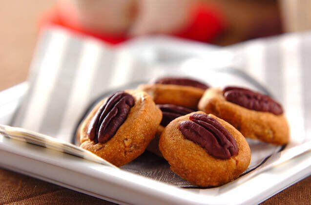 クッキーのサクサク食感、 ピーカンナッツの香ばしさがポイントの、ピーカンナッツクッキーのレシピです!飾り用のピーカンナッツがアクセントになっていて、手作りお菓子のプレゼントにも喜ばれそうですね。