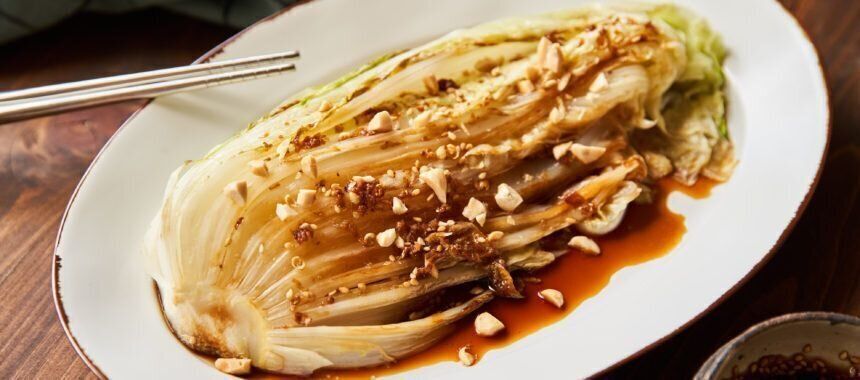 お鍋やお味噌汁などに入れがちな白菜も、つくり方次第で立派なメイン料理になるんです。白菜の甘味と、ナッツの入ったやみつきだれが相性抜群です。