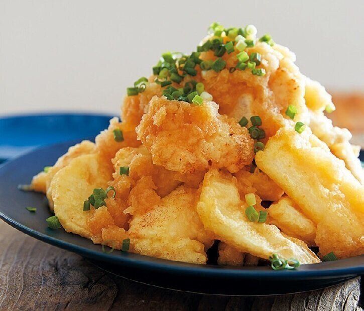 (1)の鶏肉と大根に天ぷら粉適量に表示どおりの水を混ぜたころもをつけ、中温(170℃)の揚げ油(適量)で揚げる。器に盛り、大根1/4本をすりおろし、めんつゆ大2を合わせてかけ、青ねぎ2本の小口切りを散らす。