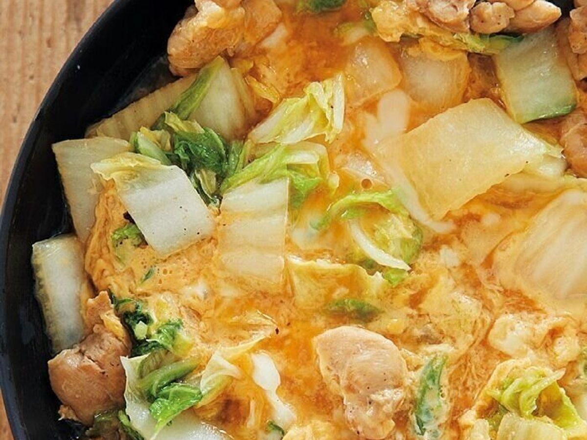 フライパンにサラダ油大1を中火で熱し、鶏肉を皮目から入れて両面を焼く。鶏肉に火が通ったら白菜を加えて炒め合わせる。白菜がしんなりしてきたら、水100ml、めんつゆ大2を加えて煮る。ひと煮立ちしたら卵を流し入れてふたをし、火を止める。半熟状になったら器に盛る。