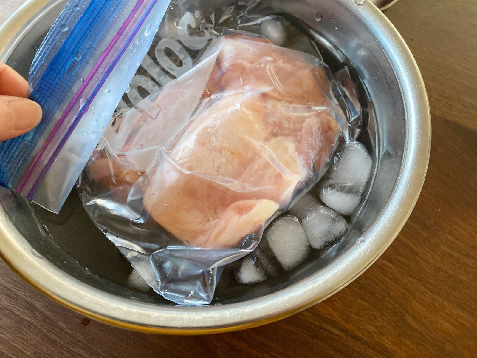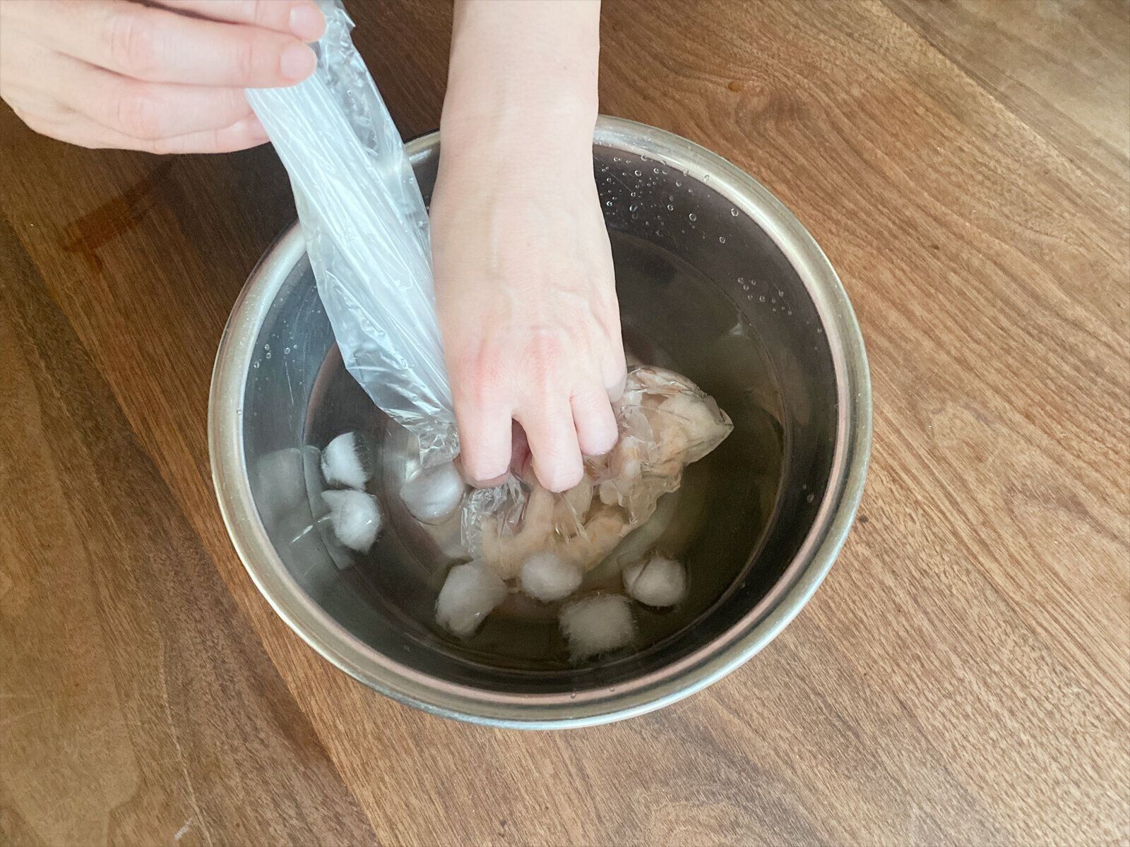 そこでおすすめしたいのが氷水解凍。フリージングバッグやポリ袋などに食材を入れて、ボウルなどにつくった氷水に沈めるという方法です。