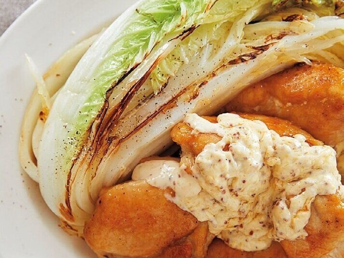 フライパンにオリーブ油大1を中火で熱し、白菜の断面を焼き、塩、こしょう各少々をふり、皿に盛る。続けてオリーブ油大1で鶏肉の両面を中火で焼き、同じ皿に盛る。空いたフライパンにマヨネーズ大4、粒マスタード小2を入れて弱火で温めてソースにする。