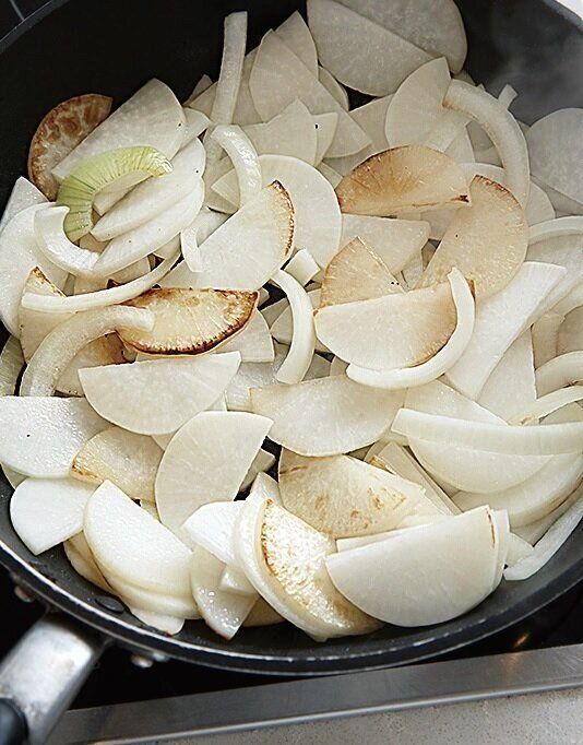 フライパンにサラダ油大さじ1/2を強めの中火で熱し、大根、玉ねぎを入れ、2分ほど動かさずに焼きつける。ざっと返し、さらに2分ほど焼きつけ、一度取り出す。