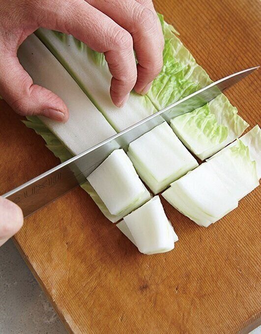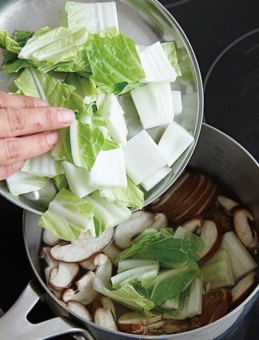 白菜は小さめの一口大に切る。しいたけは軸を除き、薄切りにする。