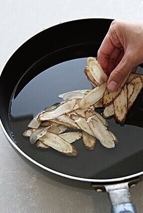 鶏肉は1枚を8等分に切って[A]をもみ込み、室温に20分ほどおく。ごぼうは皮をこそげて厚さ3mm、長さ8cmほどの斜め薄切りにし、さっと水にさらしてペーパータオルで水けを拭く。