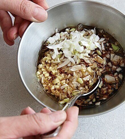 [B]ねぎ(粗みじん切り)…1/2本・しょうが(みじん切り)…1かけ・しょうゆ、酢…各大さじ2・砂糖…大さじ1 1/2・ごま油…大さじ1