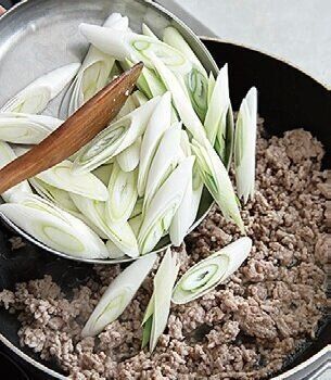 ひき肉の色が変わったら、ねぎを入れる。ねぎが透き通ってくるまで炒めると甘みが出て、うまみも増す。