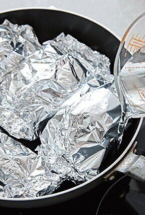 フライパンに(2)を並べ、まわりに水400mlを注いでふたをする。中火にかけ、12分ほど蒸す。ホイルごと器に盛って、口を開く。