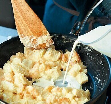 (2)弱火にして小麦粉を加え粉っぽさがなくなるまで炒める。牛乳をまず1/5量加えてよく混ぜ、全体がねっとりしたら、残りの牛乳を数回に分けて加える(写真)。[A]を加えて混ぜ、全体になじませる。
