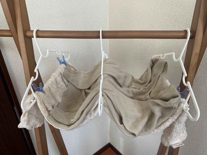 これらを干すときには、いつものようにハンガーにかけてはいけません。平干し用の洗濯ネットを使って平らに干すのがベスト。お持ちでない場合は、ハンガーとタオルなどを使って重さを分散させるなど、平らに干せるように工夫をしてください。