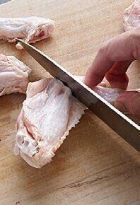 鶏肉は関節で切り離し(写真)、手羽中の身の骨にそって1本切り目を入れ、塩、黒こしょう各少々をふる(切り離した先のほうにもふる)。にんじんは皮をむいて長さを半分に切り、さらに縦四つ割りにする。玉ねぎはしんをつけたまま縦に4等分に切る。白菜はしんをつけたまま縦半分に切る。にんにくはつぶす。