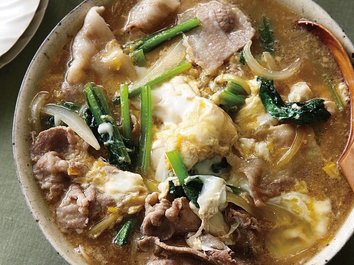 豚肉と玉ねぎの組み合わせで代謝がUP。さらに緑黄色野菜の小松菜も一緒にだし汁で煮る卵とじは、腸活にも◎。