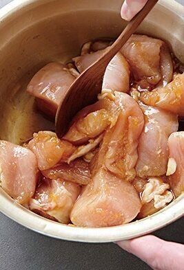 鶏肉は大きめの一口大に切り、下味の材料を混ぜ込む(写真)。れんこんは皮をむいて、厚さ7~8mmの輪切りにする。