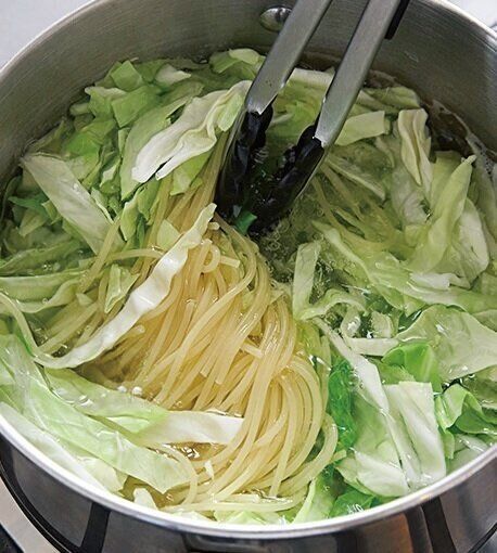 スパゲティと一緒に、オリゴ糖、食物繊維が多く、抗酸化作用のあるアブラナ科のキャベツもゆでれば、免疫力UPパスタも簡単!