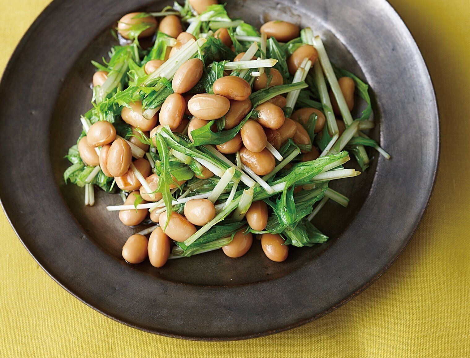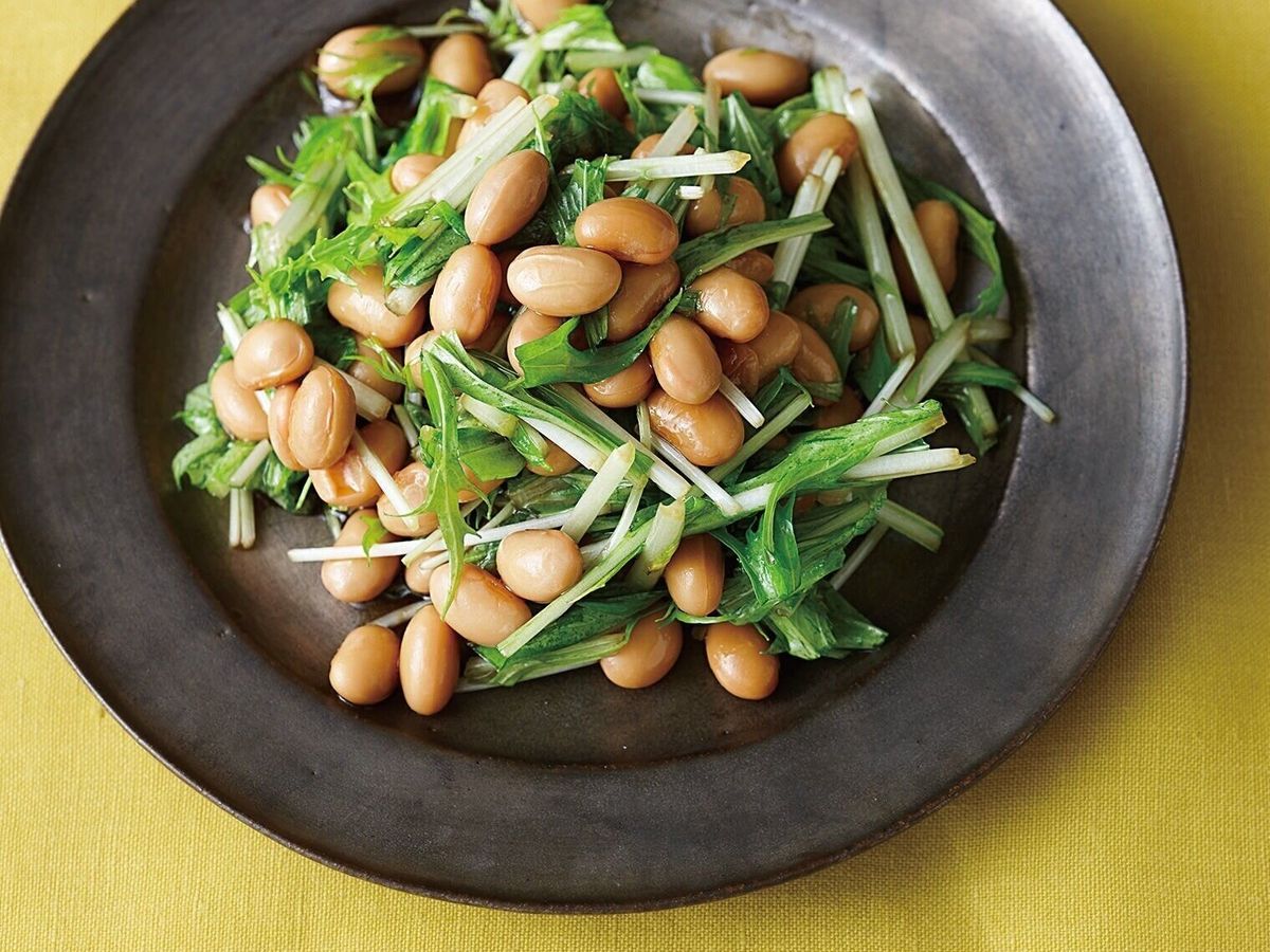 『サンキュ!』2021年3月号の「別冊:特売肉&魚の免疫力UPおかず」より大豆と水菜の中国風サラダをご紹介します。