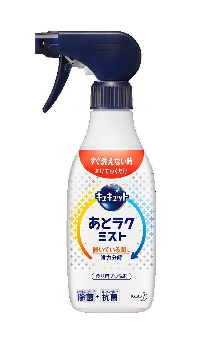 子どもの世話などで食後すぐに食器洗いができないとき、家族の食事時間がバラバラでまとめて洗いたいときなどに役立つ、食器用プレ洗剤。水につけずに食器や調理器具にまんべんなくミストをかけておくと、放置している間の菌の繁殖を抑え(※1)、汚れを落としやすく分解するので、あとは食器用洗剤とスポンジで洗うだけ(※2)でOKです。