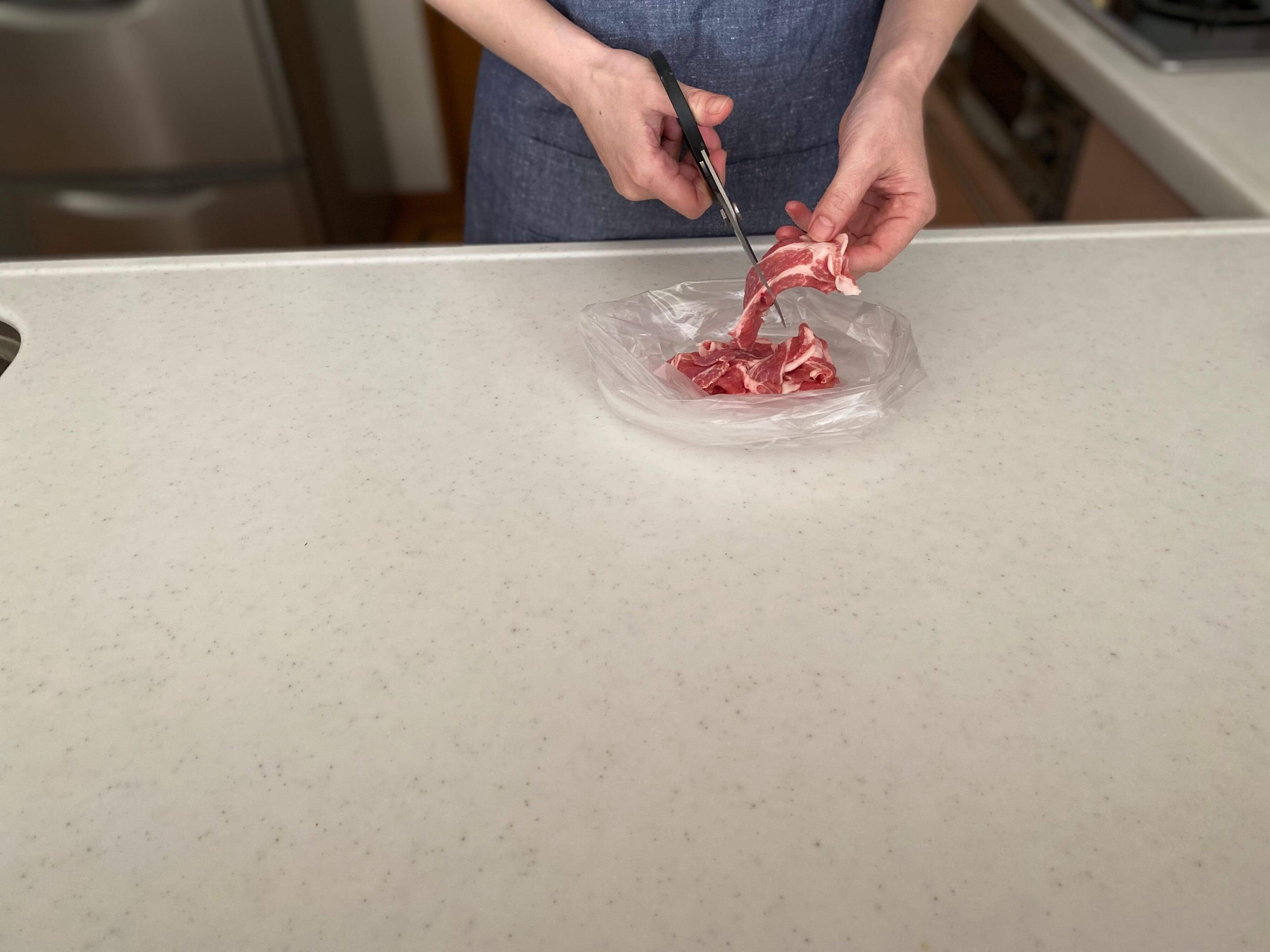 私は広げたポリ袋の上で豚の薄切り肉をキッチンばさみでカットし、ポリ袋に肉を入れたまま片栗粉をまぶしたり、調味料で下味をつけたりしています。包丁やまな板、ボウル、バットなどの調理器具を使わないから、洗い物が減るのはもちろん、ポリ袋ならもみ込みやすいので、肉に味がしみ込みやすくなっておいしく仕上がります。