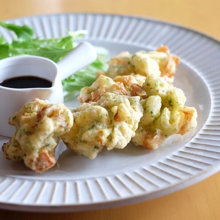 カリフラワーとちくわをかき揚げにしたレシピです。いっしょに入れた、あおさの香りがマッチしてパクパク食べられます。具材を小さくカットすることと、もっちりした衣にすることがおいしさの秘訣です。