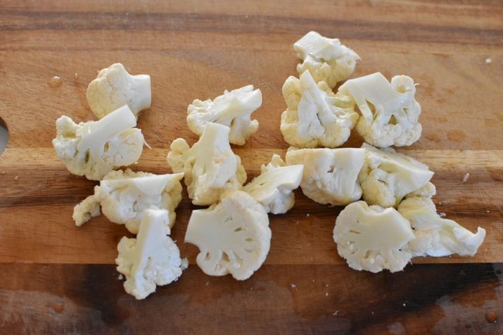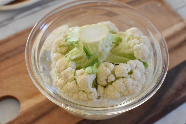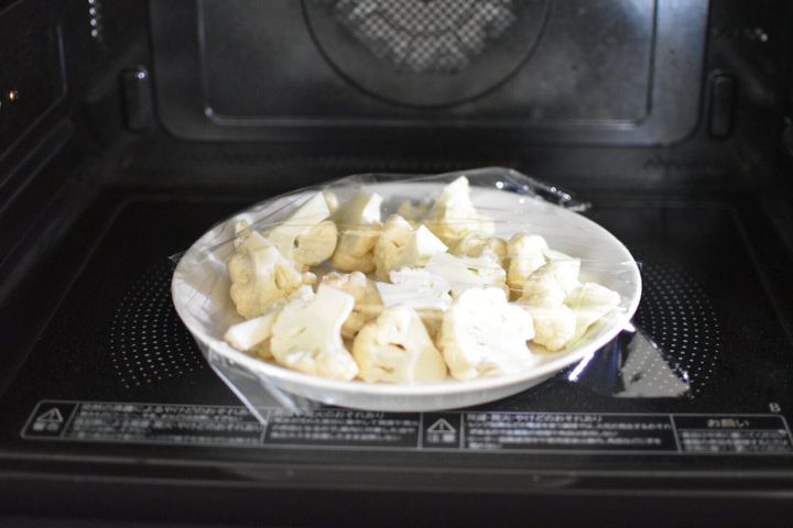 よく洗ったカリフラワーを小房に切り分けて耐熱皿に並べ、ふんわりラップをして600wで1~2分加熱する。