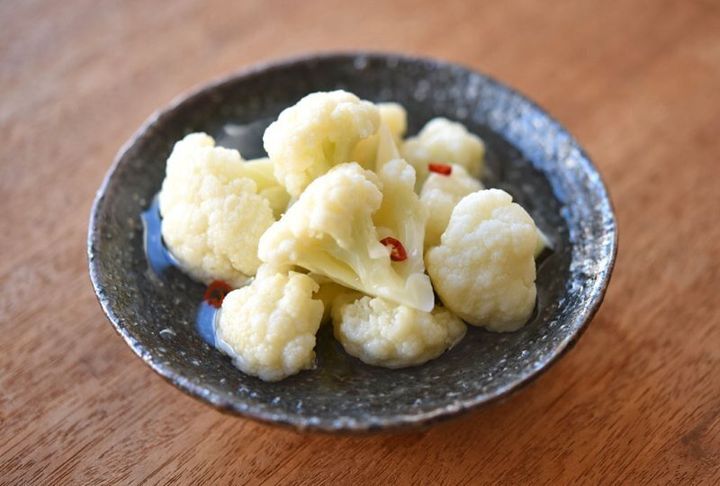 肉料理のつけ合わせにもぴったりの、カリフラワーの甘酢漬けです。ほどよい酸味と唐辛子のスパイスが効いています。味がしみ込みやすくなるように、キッチンペーパーを上にかぶせたまま漬けるのがポイントです。