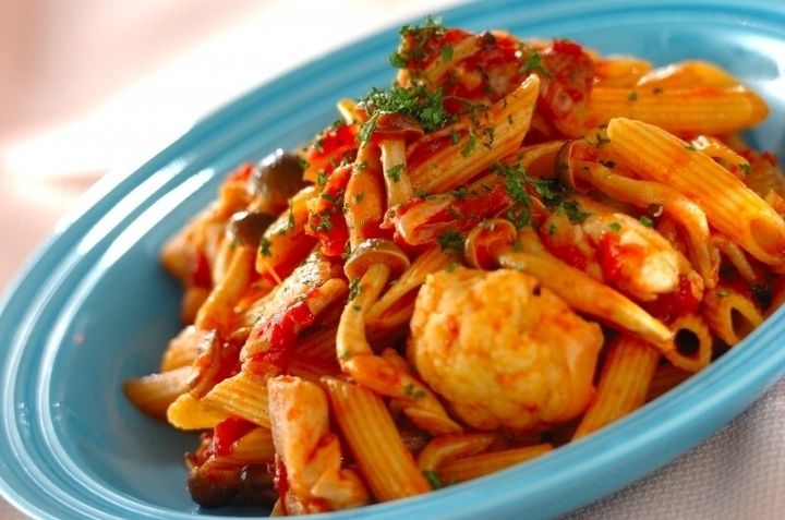 たっぷりのカリフラワーをトマトソースで煮込んだペンネのレシピです。長時間煮込むと鶏肉が固くなってしまうため、1度焼き上げてから取り出し最後にソースと合わせるのがポイント!イタリアンディナーにピッタリです。