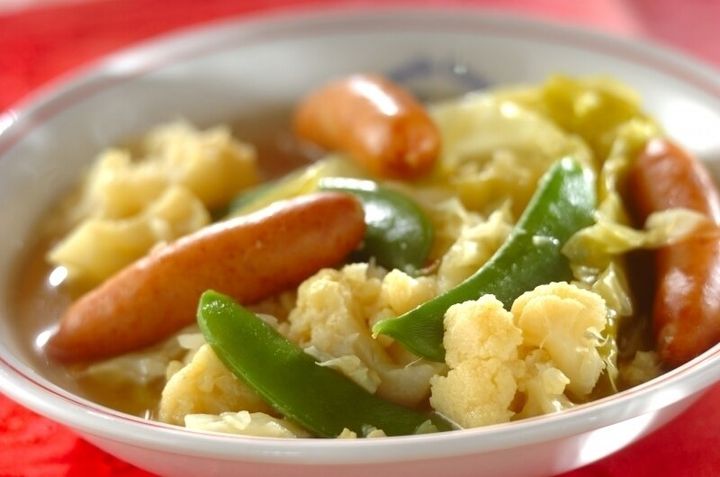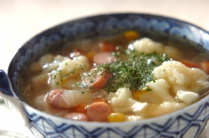 カリフラワーやソーセージをたくさん入れた、コンソメスープのレシピです。食材から溶け出たうま味が、スープにたっぷり詰まっています。食材を弱火でじっくり煮るだけの、お手軽調理です。