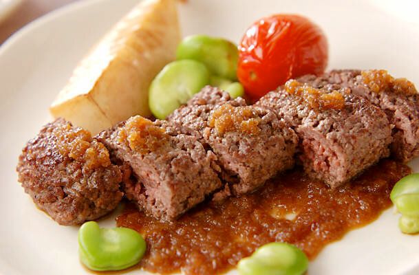 ひき肉なのに、まるで1枚のステーキのように食べられるおどろきのレシピです。牛ひき肉を使うことで、ジューシーでやわらかい口当たりに。子どもやお年寄りも食べやすい食感になりますよ。