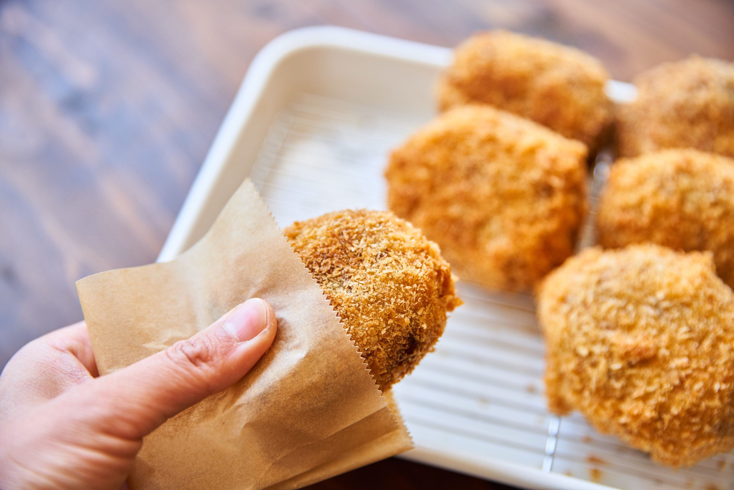 まるでお肉屋さんのコロッケのような、どこかなつかしい味わい。ソースをつけなくてもおいしく食べられます。卵や薄力粉をあらかじめ混ぜたバッター液をつくると、衣が均等について成功しやすくなりますよ。