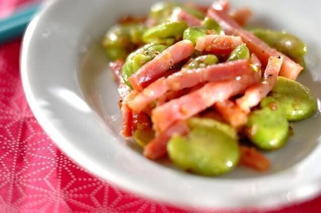 ホクホクにゆでたソラ豆とアンチョビを炒めた時短レシピ。ソラ豆のグリーンとベーコンのピンクで色合いもいいですね。アンチョビとベーコンの塩気があるので、調味料はシンプルでOK。ワインのおともにもおすすめの一品です。