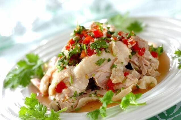 野菜やナンプラーなどをあわせた「パクチーサルサ」に、ゆで鶏を和えて仕上げるメインの一品。ゆで汁も加えて旨味をプラスします。暑い日もさっぱり食べられそうなレシピですね!