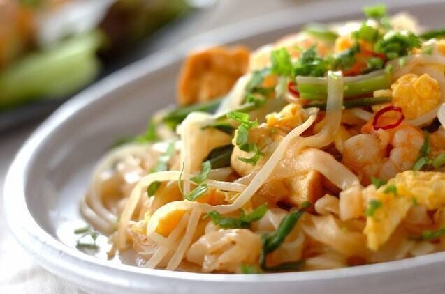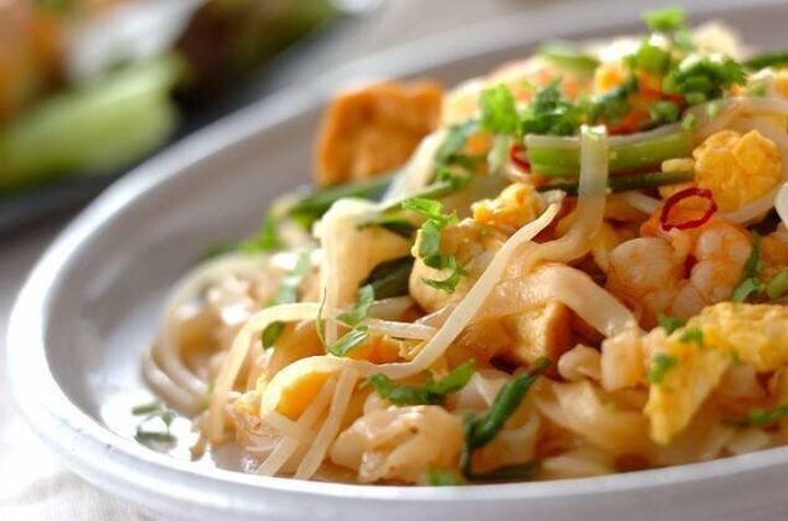 フォーのもちもち食感もポイントの、タイ風焼きそばのレシピです。エビと厚揚げも加えて食べ応えアップ。スイートチリソースやナンプラーなどを使った、甘辛酸っぱい味つけのとりこになりそうです。