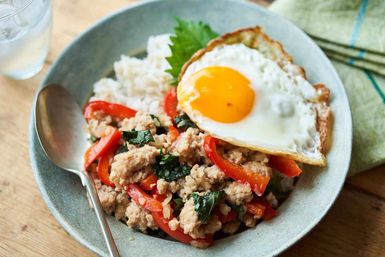 大葉をたっぷり入れて作る、さっぱりとした味わいのガパオライスのレシピ。目玉焼きと、具材の色味の組み合わせが鮮やかです。ナンプラー、オイスターソースの味わいで、ごはんが止まらなくなりそうです!