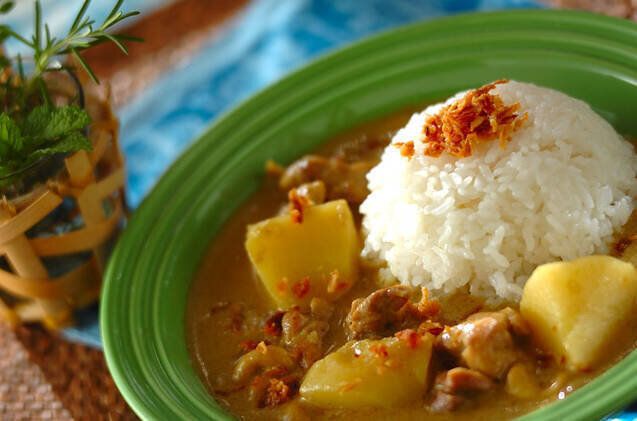 タイカレーの一種であるマッサマンカレーを、ご家庭で!シナモンやカルダモンなどの複数のスパイスと、玉ネギの甘み、ココナッツミルクの濃厚さも感じられそうなレシピです。