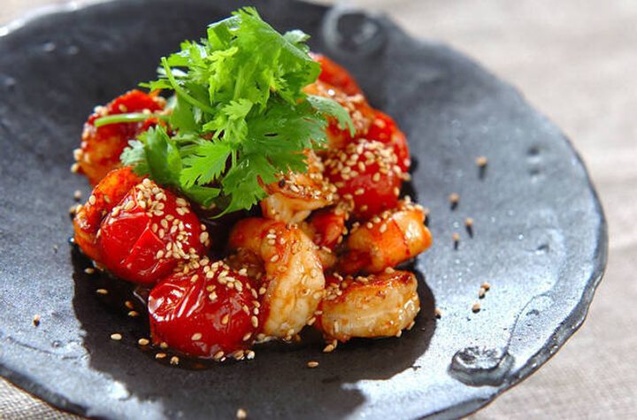 おつまみにもぴったりの、プチトマトとエビのナンプラー炒め。炒めたプチトマトのジュワッとおいしい食感や風味が、プリプリのエビ、ナンプラーの風味とよく合いそうです。さっぱりとしたお酒に合わせるのもおすすめです。
