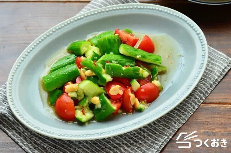 レモンの酸味とナンプラーの風味、ピーナッツの食感とコクが絶妙にマッチした、きゅうりとミニトマトのタイ風サラダ。ポリ袋を使うので、洗いものも少なく時短でつくれるのがいいですね。好みでパクチーをトッピングするのも◎。