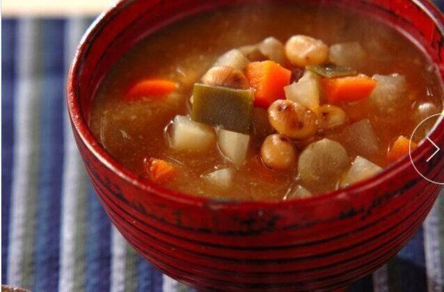 節分汁という名前のとおり、炒り大豆をふんだんにつかったお味噌汁です。節分の豆まきのあとに残った大豆はそのまま食べてもおいしいですが、お味噌汁にすることでよりおいしくたくさん消費することができます。