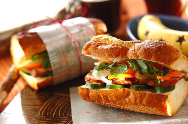 1つ目は、フランスパンを使ったベトナム風のバケットサンドのバインミーです。野菜が数種類入っているので、食べ応えも増すレシピといえます。