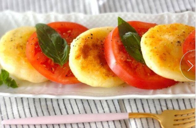 チーズ風味のじゃがいももちをつかったカプレーゼ風の一品です。チーズが苦手な人でも食べやすく、お子さんから大人まで楽しめます。バジルをトッピングすることで、より本格的なカプレーゼ風になります。