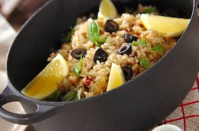 見た目も華やかな、タコとバジルのパエリア風炊き込みご飯。タコを細かくして旨味をいきわたらせるのがコツです!市販品のバジルペーストや、仕上げのバジルも使って香りたっぷりに。オリーブやレモンも鮮やかです。