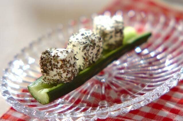 ドライバジルと、クリームチーズの相性を楽しめる一品。前菜や副菜におすすめです。きゅうりのくぼみにチーズを盛って、華やかに。きゅうりのみずみずしいおいしさで、さっぱり味わえそうです。