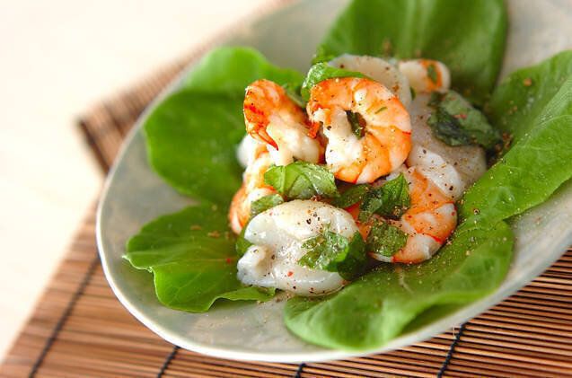 エビとホタテを使った海鮮バジルサラダをご紹介。生バジルを使用しているので、シンプルな味つけながらも風味をしっかり感じることができますよ。ワインのおつまみにもぴったりです。