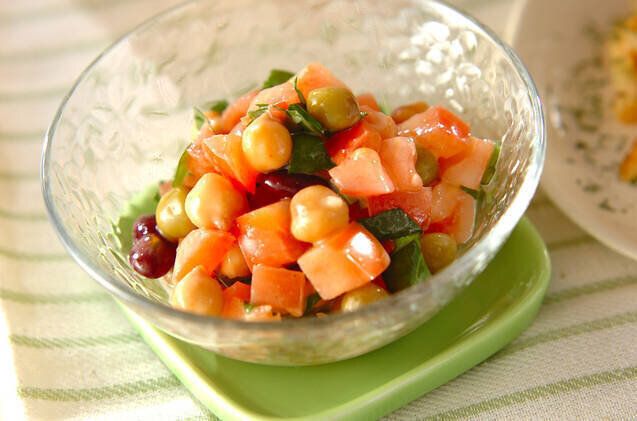 洋食の副菜にぴったりの、豆とトマトのフレンチサラダ。ミックスビーンズにトマト、バジルの組み合わせで、フレッシュにさっぱり味わえそうな一品です。お好みで野菜をプラスするのもよいですね。