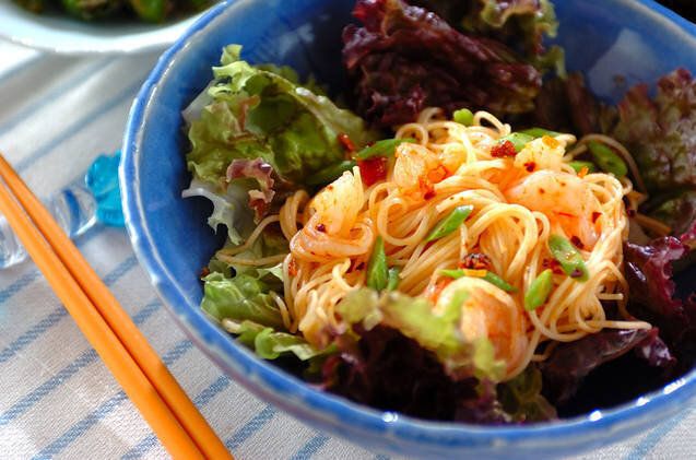 ゆでたそうめんとむきエビに、市販の食べるラー油を和えてピリ辛味に仕上げた一品です。