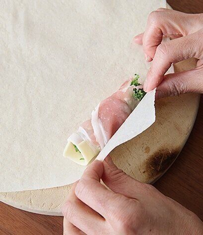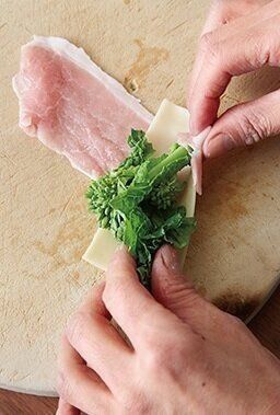 豚肉を縦に広げ、手前にチーズと菜の花をのせ、くるくる巻く(写真)。計10本作る。薄力粉を水大さじ2で溶いて、のりを用意する。