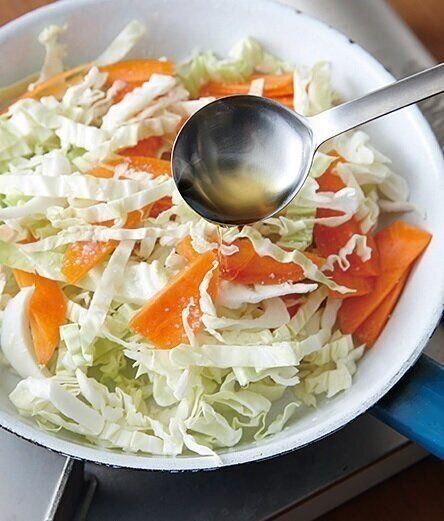 残りのキャベツは幅7~8mmに切り、にんじんは縦半分に切って厚さ5mmの斜め切りにしてフライパンに入れ、[B]を加える。中火にかけ、ふつふつしたら弱火にしてふたをして、約5分蒸し煮にする。器に盛り、好みでごまを指でつまんでひねってふる。