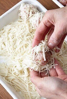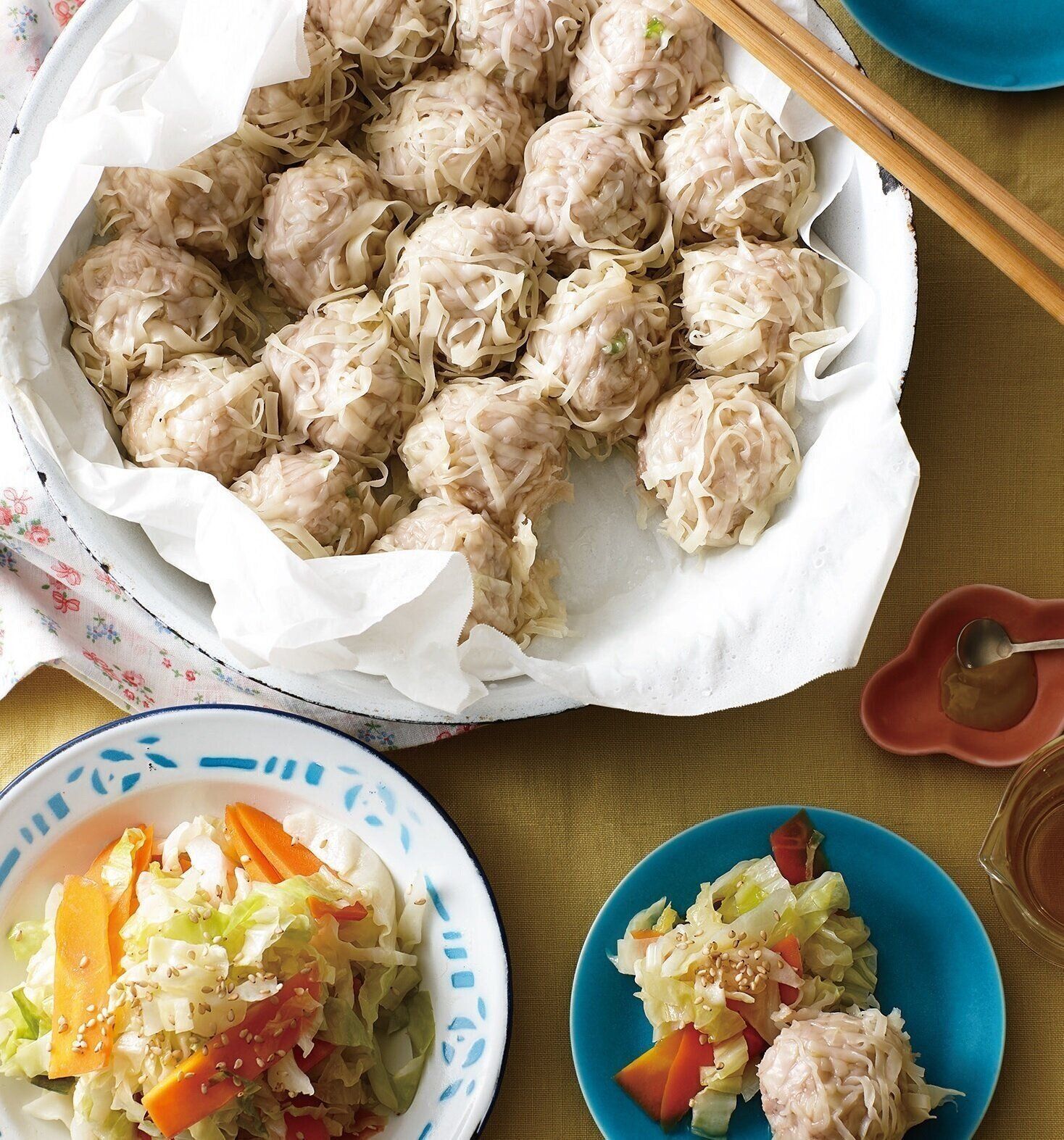 キャベツは1/3量は粗みじん切りにして塩小さじ1/4をふってもみ、しんなりしたら水けを絞る。ボウルに入れ、ひき肉、[A]を加えて粘りが出るまでよく混ぜ、20等分にして丸める。シュウマイの皮を細切りにし、丸めたあんにまぶし(写真)、形を整える。